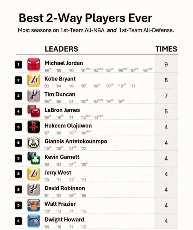 1stチームオールNBAと1stチームオールディフェンスに同じシーズンで選ばれた回数の多い選手