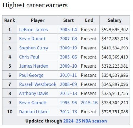 2003-04シーズン、ガーネットは年俸2800万ドルでリーグ最高額だった。当時のサラリーキャップは4400万ドル弱だから、チーム予算のかなりの割合を1人で占めていた。