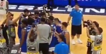 背番号5のヤニス・ラレンツァキスは気にしていない様子で、その後ろではコスタス・パパニコラウ、サナシス・アデトクンボ、タイラー・ドーシー、ニコス・ネツィポグルーが爆笑している。ヤニスとラレンツァキスはギリシャのユース代表時代からチームメイトだったので、これは完全に冗談としてやっていることだ。