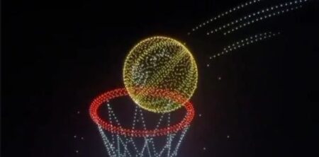 カリーは、数千機のドローンを使って空中にバスケットボールがネットを通る様子を描き出し、さらに高層ビル群が鮮やかな光で輝くという壮大なドローンとライトショーでも迎えられた。