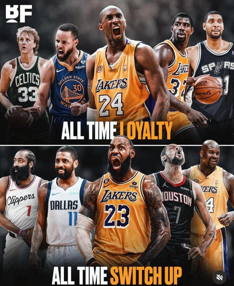 これスウィッチアップ側は全盛期に裏切った上に複数回移籍した選手だから、一回しか移籍してない選手や晩年だけ数回移籍した選手は入れてないよね。だからKG(全盛期終盤までは一途)やキッド(全盛期の移籍は全てチームからのトレード)、ジャバー(移籍一回だけ)は入らないんじゃないかな。