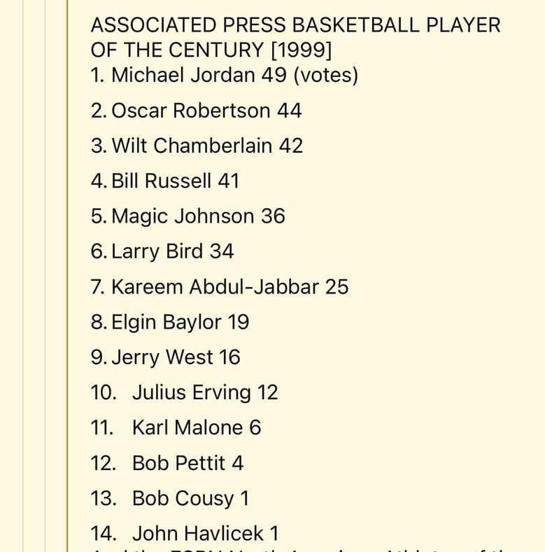 基準がパイオニア、レジェンド枠重視で、MJのみ今でいうレブロン、カリーあたりの新時代を築いたスター枠で評価されている感じ