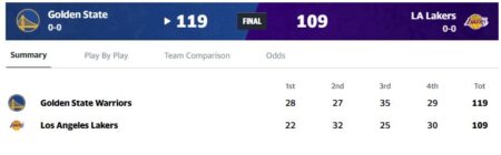 第3クォーター開始直後、ウォリアーズが19-4のランで最大17点リード。レイカーズはオースティン・リーブスが第4クォーターだけで13点、計26点で反撃して105-99まで迫ったが、ドレイモンド・グリーンの残り3分33秒の3ポイントで流れを止められた。