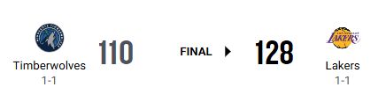 レイカーズがミネソタ・ティンバーウルブズに128-110で勝利。ルカ・ドンチッチの連続40得点発進で今季1勝1敗。ティンバーウルブズは黒星スタートが続いた。
