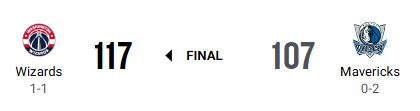 ワシントン・ウィザーズがダラス・マーベリックスに117-107。マーベリックスは開幕2連敗となった。