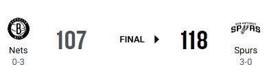 サンアントニオ・スパーズがブルックリン・ネッツに118-107で勝利し、開幕3連勝で無敗を維持した。第4Qに逆転を許しながらも終盤の10-0で押し切った