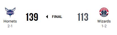 シャーロット・ホーネッツがワシントン・ウィザーズに139-113。前半の二桁ビハインドをはね返して勝利し、ウィザーズのホーム開幕戦に土を付けた。