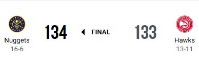 デンバー・ナゲッツがアトランタ・ホークスに134-133で競り勝ち、アウェー9連勝を飾った。