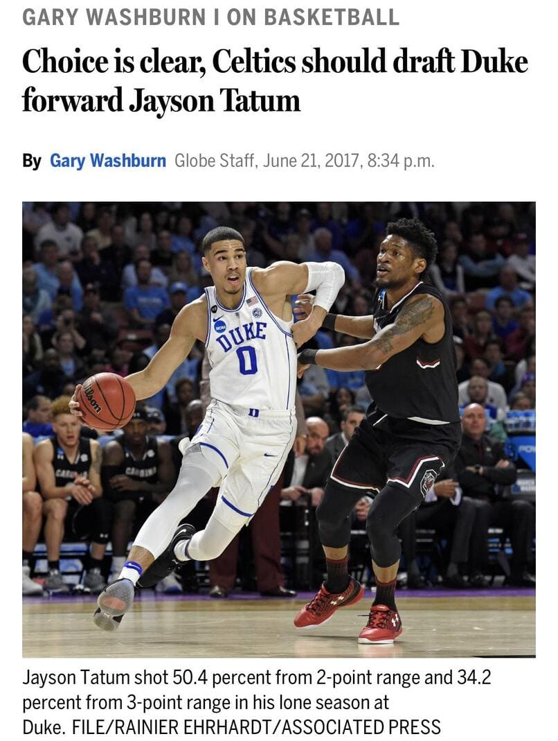 テイタムをセルティックスが指名するなんて話をしていたのは、ドラフト前夜か当日の朝になってからのボストンの新聞くらいだった。