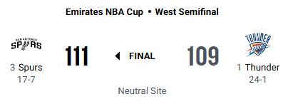 サンアントニオ・スパーズがオクラホマシティ・サンダーを111-109で退け、NBAカップ決勝に進出した。