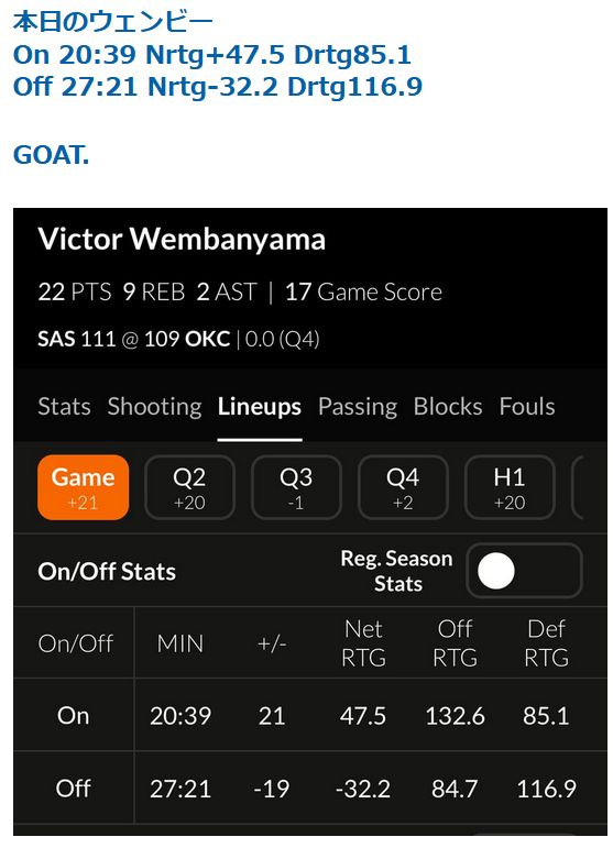 【NBA】ウェンバンヤマ、異次元のレーティングをカップ戦準決勝で叩き出す