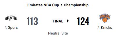 ニューヨーク・ニックスがサンアントニオ・スパーズに124-113で勝ち、NBAカップを制した。