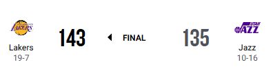 ロサンゼルス・レイカーズは敵地でユタ・ジャズに143-135で勝利し、直近4試合で3勝とした。