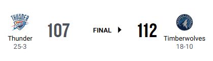 ミネソタ・ティンバーウルブズがオクラホマシティ・サンダーに112-107で勝利した。サンダーは今季3敗目で、直近3試合で2敗となった。シーズン成績はサンダーが25勝3敗、ティンバーウルブズが18勝10敗。