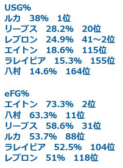 まぁ リーブス、八村は立派だし ドンチッチのUSG%はやっぱ意味不明