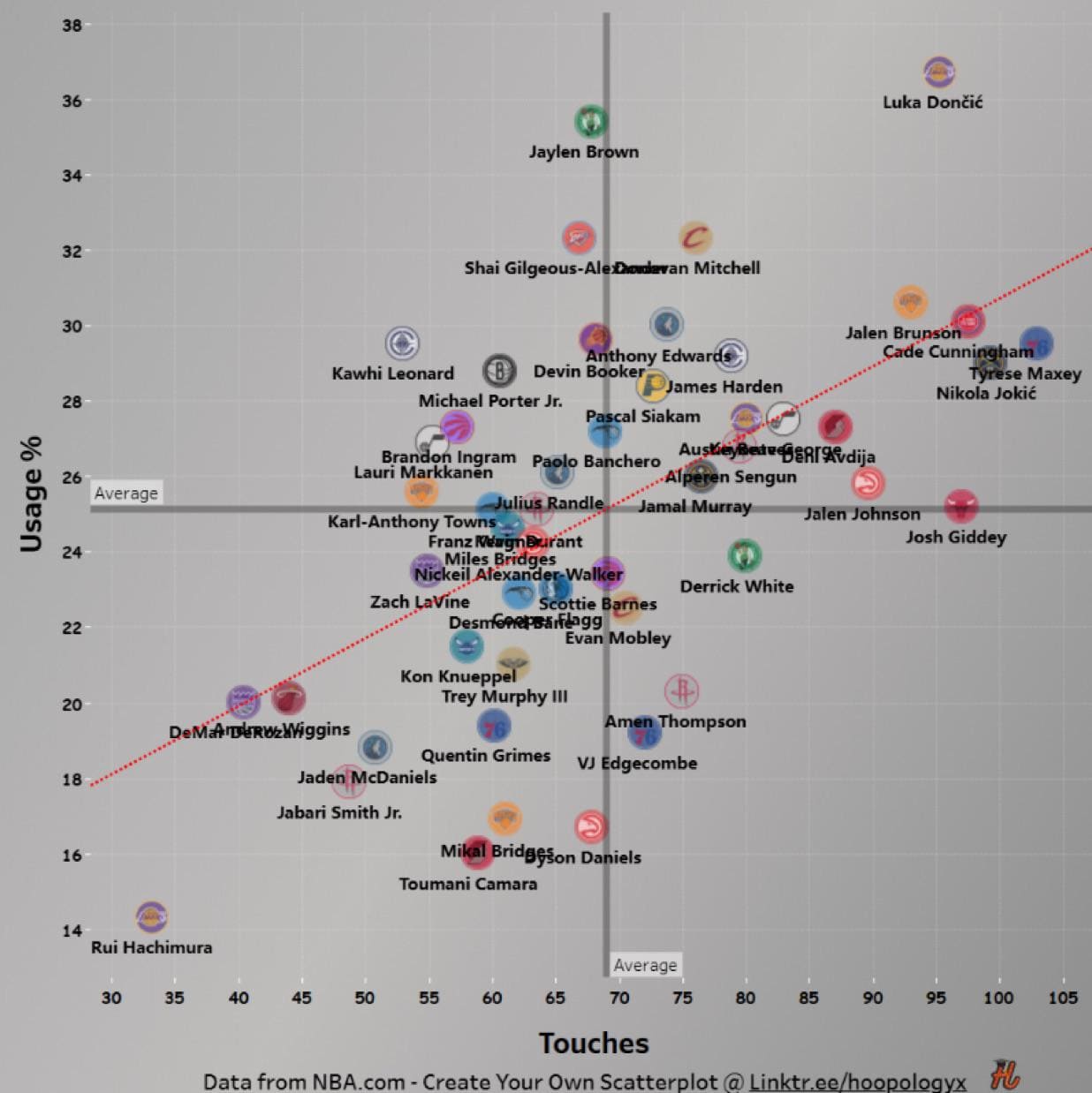 図はNBAの選手を「ボールに触れた回数(Touches)」と「攻撃の主役度(Usage%)」で比べたものだ。右へ行くほどボールを預けられ、上へ行くほどシュートやフリースロー、ターンオーバーで攻撃を終える割合が高い。