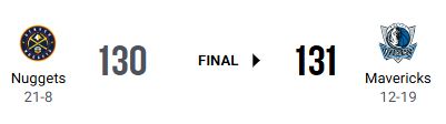 マーベリックスは今季12勝19敗、ナゲッツは21勝8敗となった。