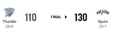 サンアントニオ・スパーズがオクラホマシティ・サンダーに130-110で勝利した。スパーズは今季22勝7敗となり、西地区2位を守った。サンダーは26勝4敗で、今季4敗のうち2敗をスパーズに喫している。