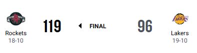 後半序盤、ロケッツは18-5のランで一気に点差を広げ、主導権を固めた。レイカーズはオースティン・リーブスが左ふくらはぎの痛みで後半に戻らず、反撃の形を作れなかった。