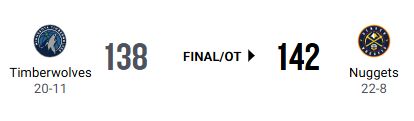 デンバー・ナゲッツが延長戦の末、ミネソタ・ティンバーウルブズを142-138で下し、今季の直接対決を3戦全勝とした。