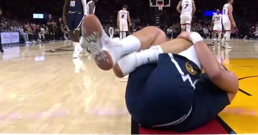 ・デンバー・ナゲッツのニコラ・ヨキッチが、月曜夜にマイアミで行われた試合の前半終了間際に左ヒザを痛め、足を引きずってロッカールームへ下がった。