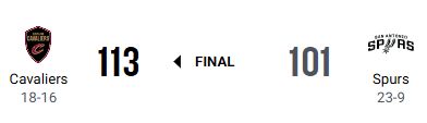 第3クォーター終了時点でキャバリアーズは8点を追う立場となったが、第4クォーターに入るとジェイレン・タイソンの連続3ポイントで逆転に成功した。キャバリアーズは一気にリードを10点以上に広げ、スパーズの反撃を許さずに逃げ切った。