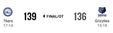フィラデルフィア・セブンティシクサーズが延長戦の末、メンフィス・グリズリーズに139-136で勝ち、連敗を3で止めた。