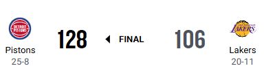 デトロイト・ピストンズがロサンゼルス・レイカーズに128-106で勝利した。