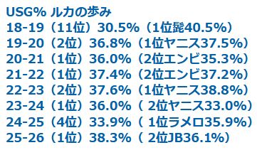 むしろルカはTS%.604、PPP1.17と効率良いし、USG%高い方が価値がある