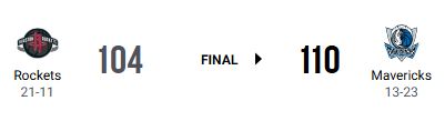 ダラス・マーベリックスがヒューストン・ロケッツに110-104で勝利した。マーベリックスは4連敗を止め、ホームでは直近7試合で6勝となった。ロケッツは4連勝が止まった。
