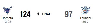シャーロット・ホーネッツがオクラホマシティ・サンダーに124-97で勝利した。サンダーは今季ワーストの失点差で、2連敗となった。ホームでの敗戦も今季2度目で、シーズン成績は30勝7敗になった。