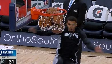 ビクター・ウェンバンヤマ(サンアントニオ・スパーズ)が、リングに引っかかって動かなくなっていたバスケットボールを、ハイキックでまとめて蹴り落とした。