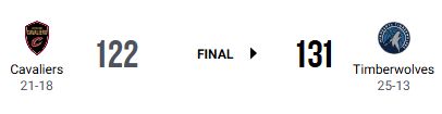 第4クォーター、キャバリアーズはサム・メリルの3ポイントなどで追い上げ、一時は4点差まで迫ったが、ティンバーウルブズが最後までリードを守り切った。アンソニー・エドワーズはこの試合で通算10000得点に到達した。