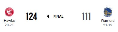 アトランタ・ホークスがゴールデンステイト・ウォリアーズに124-111で勝利し、3連勝とした。