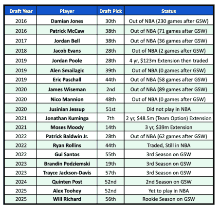 せっかくの高順位でスター選手を指名できなかったけど、2巡目や1巡目下位でローテ選手を指名できているから、ドラフト候補生は誰もGSWに行きたくないという意見は過剰な批判だと思うね