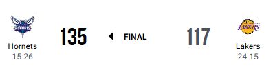 シャーロット・ホーネッツがロサンゼルス・レイカーズを135-117で下し、西海岸遠征を2勝1敗とした。
