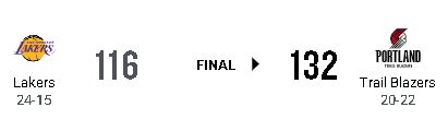 ポートランド・トレイルブレイザーズがロサンゼルス・レイカーズを132-116で下した。ブレイザーズは直近9試合で7勝と好調を維持した。レイカーズは前戦に続く黒星で2連敗となった。