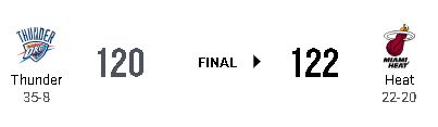 マイアミ・ヒートがオクラホマシティ・サンダーに122-120で勝った。終盤にアンドリュー・ウィギンズが残り31秒で3ポイントを決め、ヒートがそのまま逃げ切った。