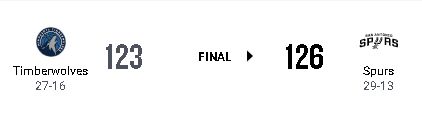 スパーズは第2クォーターに球団史上4番目となる48得点を記録し、前半だけで大差をつける猛攻を見せた。 しかしウルブズは後半に反撃を開始し、第4クォーターにはアンソニー・エドワーズが3ポイント5本を含む26得点を挙げる爆発力を見せ、残り1分で一時逆転に成功した。