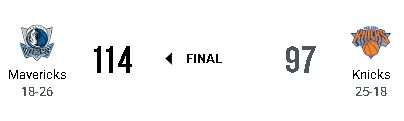 ダラス・マーベリックスがニューヨーク・ニックスに114-97で快勝し、3連勝を飾った。 ニックスはこれで4連敗となり、直近11試合で9敗目を喫した。