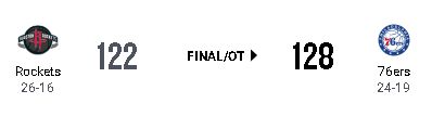 フィラデルフィア・セブンティシクサーズが延長戦の末、ヒューストン・ロケッツに128-122で勝った。ロケッツの連勝は3で止まった。セブンティシクサーズはホーム成績を12勝12敗の五分に戻した。