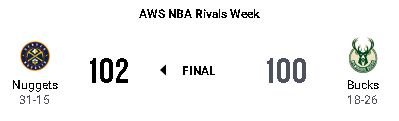終盤、ナゲッツはティム・ハーダウェイJr.が重要なフリースローを沈めてリードを保った。バックスは最後にカイル・クズマが逆転を狙ったシュートを放ったがリングに弾かれ、ナゲッツが逃げ切った。