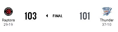 トロント・ラプターズが接戦の末にオクラホマシティ・サンダーを103-101で破り、4連勝を飾った。 サンダーはインディアナ・ペイサーズ戦に続く敗戦となり、今季3度目となる2連敗を喫した。ホームでの敗戦はこれが今季4度目となる。