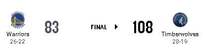 第2クォーター終盤、ティンバーウルブズは21-4の猛攻を見せて主導権を握った。このランの間にジュリアス・ランドルが10得点を挙げ、53-38とリードを広げて前半を折り返した。 ウォリアーズは3ポイントシュート成功率がシーズン最低の23.1%(39本中9本成功)に低迷し、反撃の糸口を掴めなかった。ルディ・ゴベアがインサイドを支配したティンバーウルブズがそのまま逃げ切った。