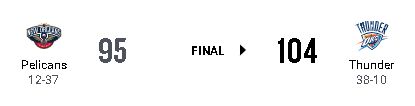 オクラホマシティ・サンダーがニューオーリンズ・ペリカンズを104-95で下し、今季初の3連敗を回避して連敗を2で止めた。 ペリカンズは連勝が2で止まった。