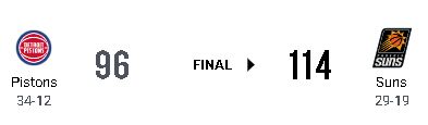 サンズは試合開始から3ポイントシュートが好調で、最初の4本を連続で成功させるなど主導権を握り、72-56と大きくリードして前半を折り返した。 第3クォーター中盤、ピストンズが反撃を見せ一時77-74と3点差まで迫ったが、サンズはそこから立て直し、93-81とリードを広げて第4クォーターへ突入した。