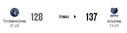 この勝利でグリズリーズの連敗は6で止まり、ウルブズの連勝は4でストップした。