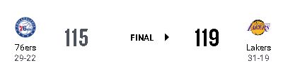 ロサンゼルス・レイカーズがフィラデルフィア・セブンティシクサーズに119-115で勝利し、シクサーズの連勝を5で止めた。