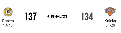 第4クォーター残り1分49秒でペイサーズが4点をリードしていたが、ニックスが反撃し、残り0.2秒にカール・アンソニー・タウンズがフリースロー2本を決めて同点とし、延長戦に突入した。