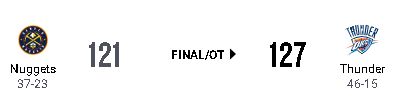 オクラホマシティ・サンダーが延長戦の末、デンバー・ナゲッツに127-121で勝利した。